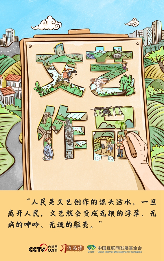 2014年10月15日,在文艺工作座谈会上,习近平总书记深刻揭示了文艺创作与人民之间的联系。他指出,人民是文艺创作的源头活水,一旦离开人民,文艺就会变成无根的浮萍、无病的呻吟、无魂的躯壳。一系列反喻表意强烈,引人深思,强调了坚持以人民为中心的创作导向。