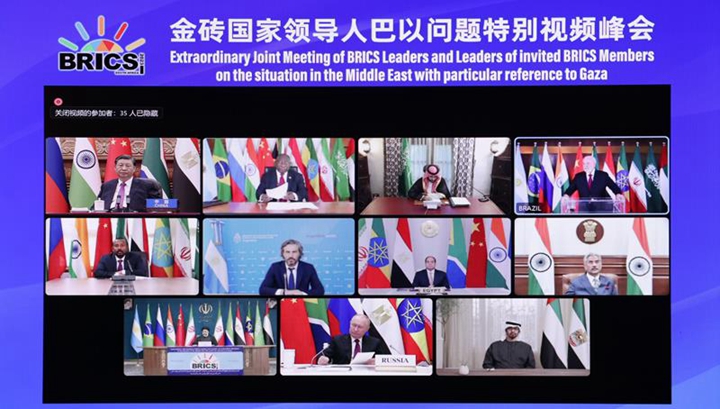 去年11月,金砖国家领导人巴以问题特别视频峰会召开,与会领导人就应对巴以新一轮冲突造成的挑战并持续推动巴以问题公正持久解决展开交流,协调立场,发出呼吁,达成共识,并采取积极行动,发出清晰的正义之声、和平之声。