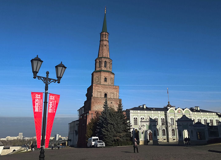 夜幕下的喀山,处处流光溢彩。一辆辆载着各国贵宾的车辆掠过克里姆林宫城墙“金砖灯光秀”,驶向自由广场上的喀山市政厅。