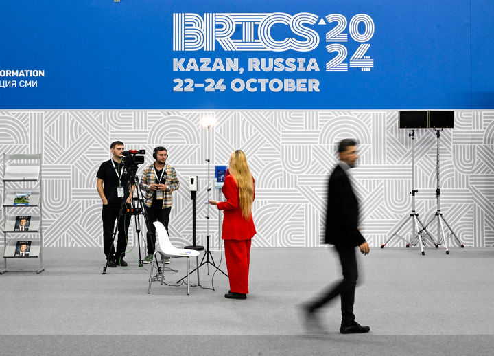 2024年10月23日,媒体工作人员在俄罗斯喀山金砖峰会新闻中心工作。新华社记者 申宏 摄
