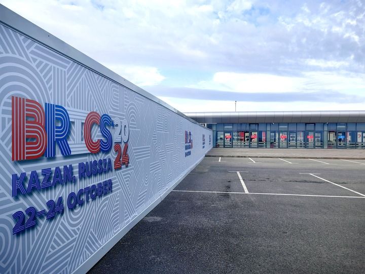 这是2024年10月23日在俄罗斯喀山金砖峰会新闻中心拍摄的金砖峰会标识。新华社记者 申宏 摄