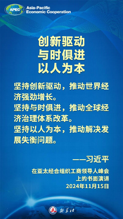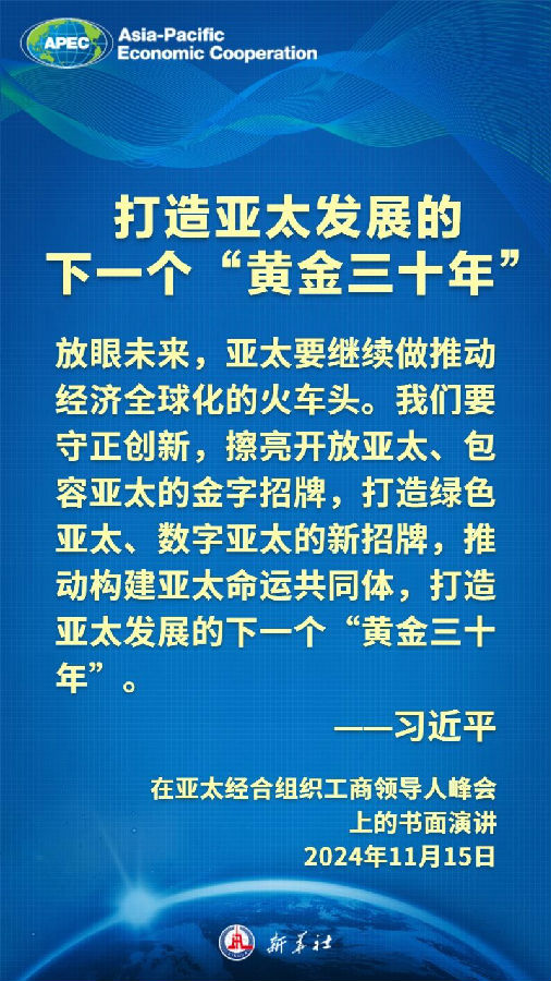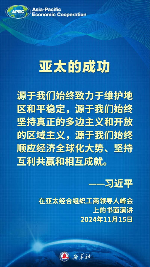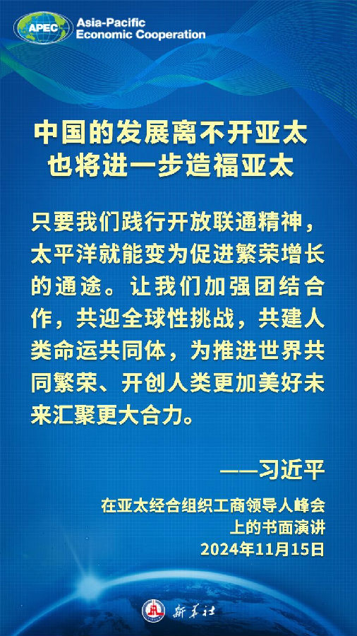 当地时间11月15日上午,国家主席习近平向在利马举行的亚太经合组织工商领导人峰会发表题为《把握时代大势 共促世界繁荣》的书面演讲,这样阐述亚太合作——