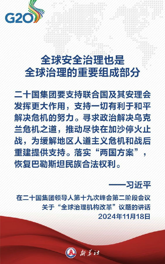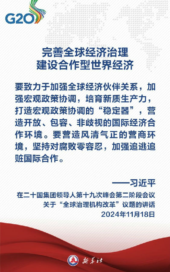 当地时间11月18日下午,国家主席习近平在巴西里约热内卢继续出席二十国集团领导人第十九次峰会。在峰会第二阶段会议围绕“全球治理机构改革”议题讨论时,习近平发表题为《携手构建公正合理的全球治理体系》的重要讲话。