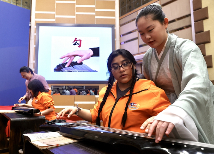 2024年3月20日,美国华盛顿州中学生代表团北京大学交流活动在北京大学英杰交流中心举行。图为来自华盛顿州的中学生体验古琴。