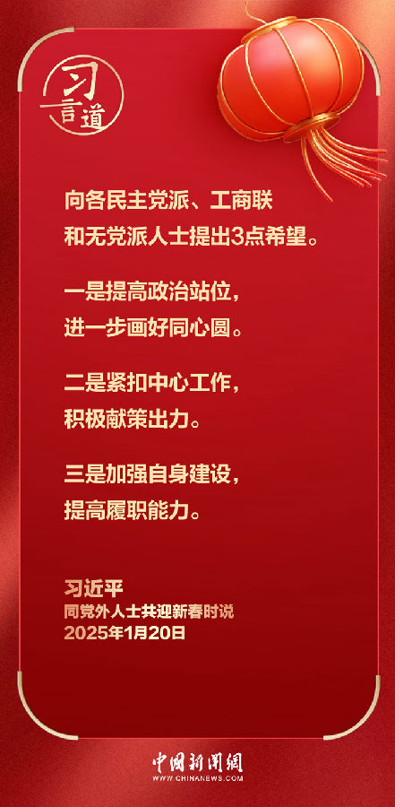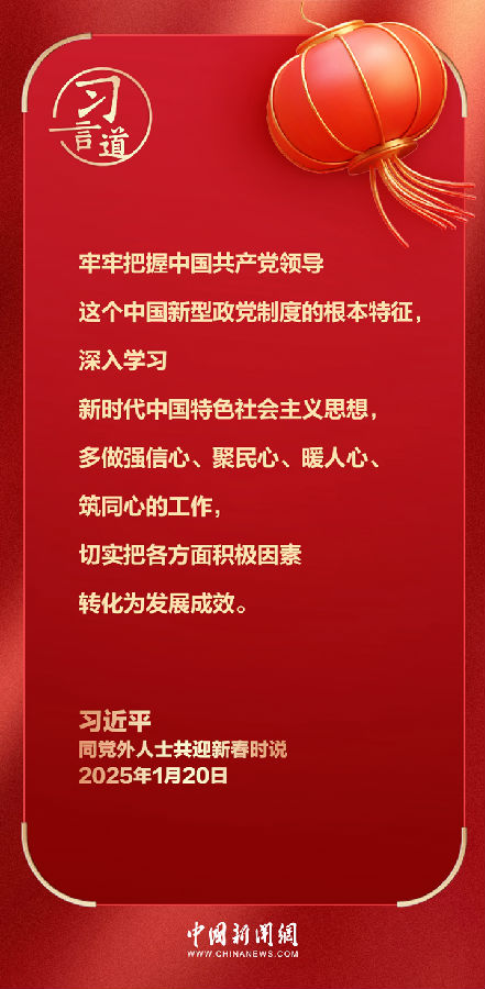 在中华民族传统节日乙巳蛇年春节即将到来之际,中共中央总书记、国家主席、中央军委主席习近平20日在人民大会堂同各民主党派中央、全国工商联负责人和无党派人士代表欢聚一堂,共迎佳节。习近平代表中共中央,向各民主党派、工商联和无党派人士,向统一战线广大成员,致以诚挚问候和新春祝福。