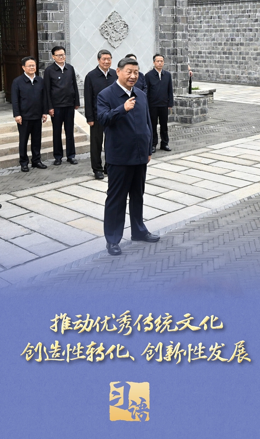 中华文明历经沧桑留下的瑰宝,习近平总书记十分珍视。在天津古文化街,指出“中国式现代化离不开优秀传统文化的继承和弘扬”;在江西景德镇,强调“老祖宗传下来的优秀传统文化,我们要继续攥在手里,与时俱进,让它发扬光大”;在关帝文化产业园,叮嘱“文化遗产是老祖宗留下来的宝贵财富,要保护好、传承好”;在龙门石窟,感慨“中华文明博大精深,值得我们多到实地去寻溯”……