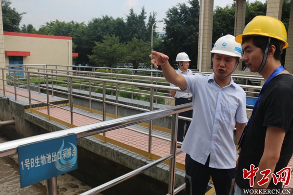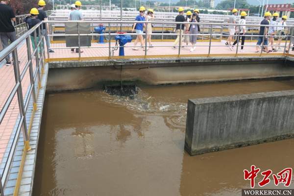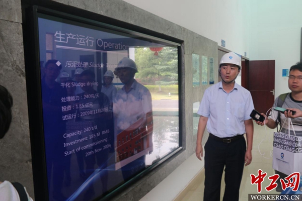 工作人员介绍污泥处理过程