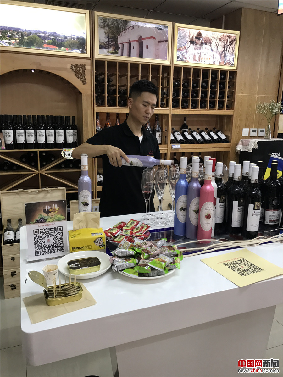 7月1日,“共舞长江经济带——探访长江经济带区域协同生态发展之路”网络主题活动采访团到达此次长江经济带采访的第二站四川成都双流区。图为自贸区内摩尔多瓦国家馆内,工作人员邀请记者品尝来自摩尔多瓦的葡萄酒。中国网记者吴佳潼摄