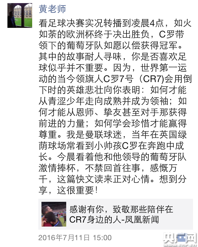 可能很多人会误解,黄大年只知工作,不懂生活。其实在朋友圈里,黄大年的兴趣爱好颇为丰富。2016年7月11日,作为一名曼联球迷,他熬夜看欧洲杯,为葡萄牙队夺冠欢呼。