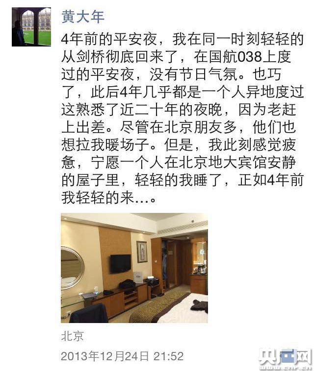 “4年前的平安夜,我在同一时刻轻轻的从剑桥彻底归来了。也巧了,此后4年几乎都是一个人异地度过这熟悉了近二十年的夜晚,因为老赶上出差……”