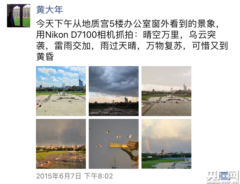 他还是摄影发烧友,曾经在朋友圈中用照片记录生活,“今天下午从地质宫5楼办公室窗外看到的景象,用相机抓拍:晴空万里,乌云突袭,雷雨交加,雨过天晴,可惜又到黄昏。”