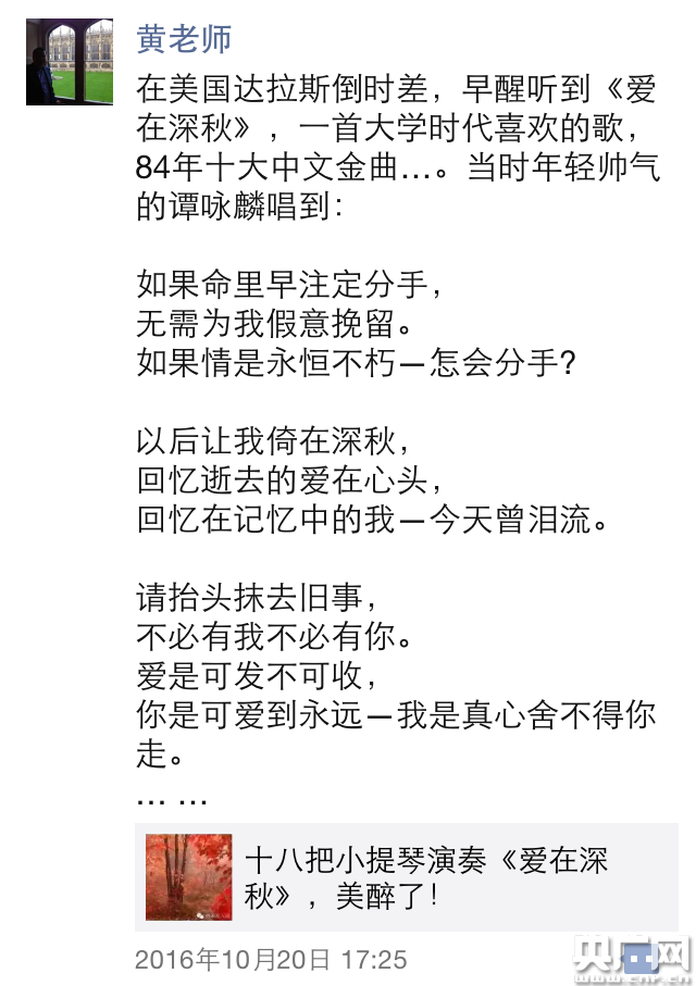 “在美国达拉斯倒时差,早醒听到《爱在深秋》,一首大学时代喜欢的歌,84年十大中文金曲。当时年轻帅气的谭咏麟唱到……”