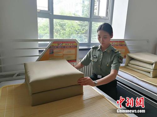 毛雯在整理自己的被褥 中新网记者 张尼 摄 训练要托7斤多礼宾枪 1996年出生的四川姑娘毛雯是三军仪仗队女兵中队一班的一名战士。1米79的个头让她在一班的14个姑娘里格外显眼。 2015年入伍至今,毛雯已在女兵中队度过了两年的时光。 “从小我就梦想着能成为一名军人,所以2015年高考结束拿到大学录取通知书后,我没有直接就读,而是选择了入伍。”毛雯告诉记者,自己一开始并不知道入伍后的具体去向,临行前她才得知自己被选入了仪仗队,这一消息让她很是兴奋。 怀着激动的心情来到北京后,毛雯开始了自己的军旅生涯。然而,入伍后的高强度训练却让这个“95后”独生女一度吃不消。 毛雯回忆说,刚来北京时,她不是很适应这里干燥的气候,还出现过流鼻血的现象。而班里的姑娘们也都有过大大小小的身体状况,因为训练强度大,有女兵的生理期甚至变得不规律。但对她们来说,最大的挑战还是力量上的不足。 “我们和仪仗队男兵用的枪是一样的,有七斤多重,托着它做动作对于刚入伍的女孩来说非常吃力,每天因为练习托枪,胳膊都抬不起来了。” 毛雯说,为了加强自己的体能,她和班里的战友们刻苦训练,除了平时的正常训练外,还专门加强了上肢力量的训练。 此外,就连平时踢正步时,姑娘们的腿上也要绑上沙袋。一天下来,汗水都能把训练服湿透。