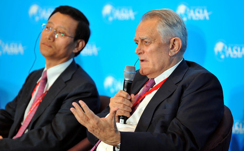 资料图: 4月8日,美银美林全球企业和投资银行部亚太区主席贺利华(右)在博鳌亚洲论坛2013年年会分论坛上发言。 新华社记者 郭程 摄