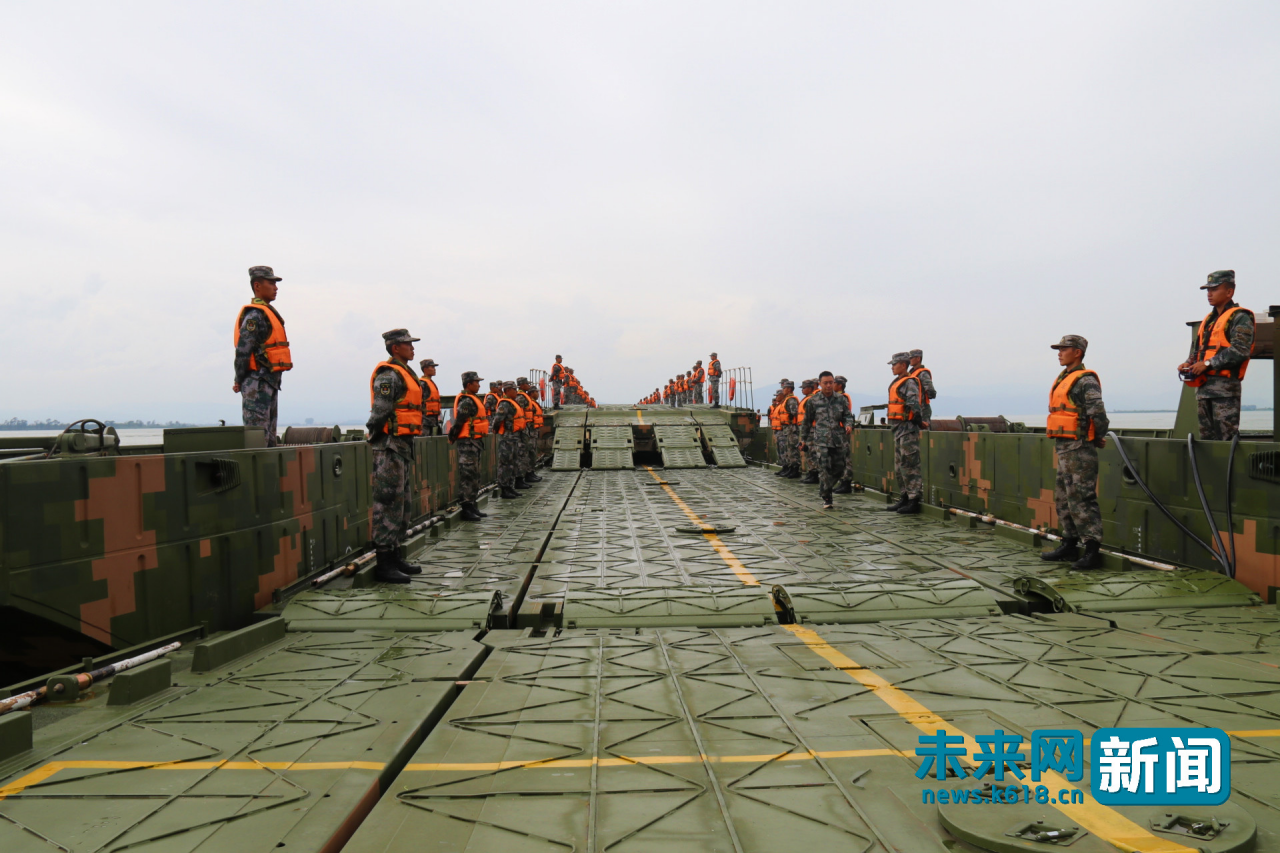 此次演练中,两百多米长的浮桥架设仅用时18分钟。营长告诉未来网记者,浮桥间的对接是其中的难点,晃动大,有误差就会影响对接的准度和时间。