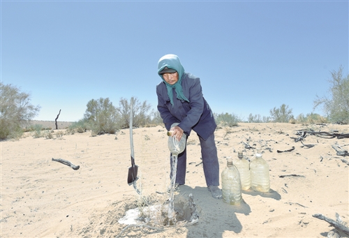 早些年,图布巴图夫妇每年的退休金不到10万元,可是15年下来,买苗、买车、打井、加油,就已经投进去80多万元。梭梭没长大时,为省苗木钱,他就开始了各种实验。把梭梭的枝条剪断,泡上两天再埋到土里,也长出了梭梭。把胡杨的根挖下一节,再埋进土里,小胡杨也冒出来了。如今,留守在古日乃嘎查和他做伴的那顺、阿拉腾苏和两位牧民都佩服不已,便给那个挖根的地方起名“图布巴图胡杨坑”。