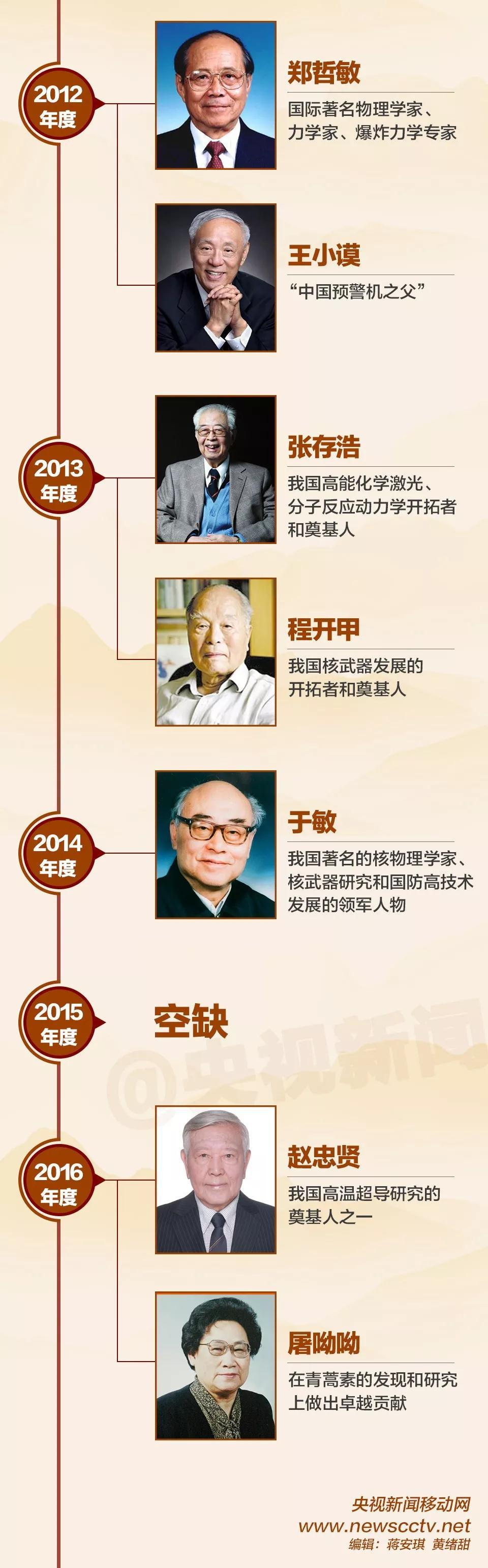国家科学技术奖励大会今天上午10时在人民大会堂开幕,2017年度国家最高科学技术奖、“国家三大奖”——国家自然科学奖、国家技术发明奖、国家科学技术进步奖,及中华人民共和国国际科学技术合作奖揭晓。其中,最引人注目的就是国家最高科学技术奖。自1999年设立以来,到2016年度共有27位科学家登上了我国科技界的最高领奖台,被授予了“国家最高科学技术奖”。通过一张图,一起认识这27位可敬的、为国家做出突出贡献科学家们。