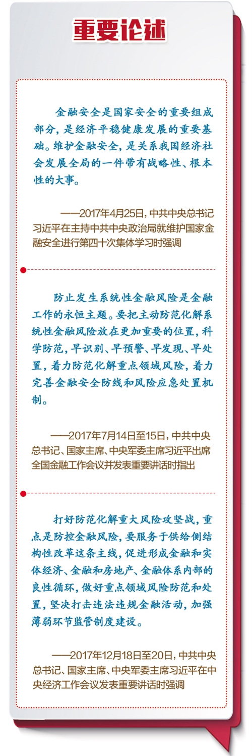 金融是国家的核心竞争力,党中央高度重视防控金融风险、保障金融安全。党的十九大报告强调,健全金融监管体系,守住不发生系统性金融风险的底线。中央经济工作会议部署了防范化解重大风险、精准脱贫、污染防治三大攻坚战,并强调“打好防范化解重大风险攻坚战,重点是防控金融风险”。