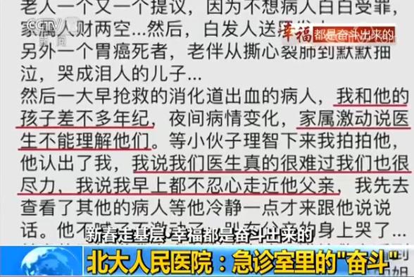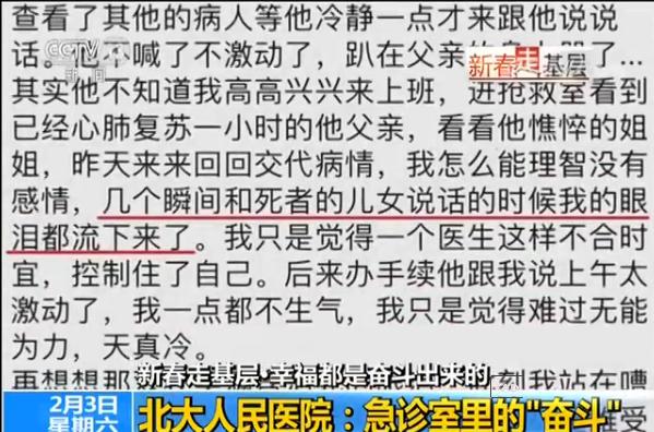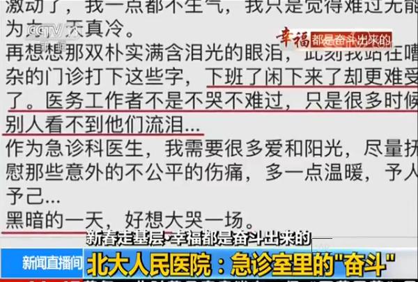 习近平总书记在2018年新年贺词中提到,“幸福都是奋斗出来的”,把蓝图变为现实,将改革进行到底,无不呼唤不驰于空想、不骛于虚声的奋斗精神,无不需要一步一个脚印、踏踏实实干好工作。《新春走基层》为您讲述北京大学人民医院急诊科的奋斗故事。