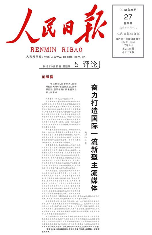 央视网消息:9月27日出版的人民日报在显著位置刊发央视评论员文章《奋力打造国际一流新型主流媒体》。全文如下: