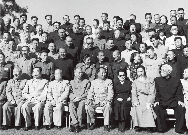 中华人民共和国第一届全国人民代表大会第一次会议全体代表于1954年9月21日合影。 毛泽东主席和代表们在一起。前排左起:董必武、周恩来、李济深、刘少奇、毛泽东、宋庆龄、张澜、林伯渠。 新华社稿 侯波/摄