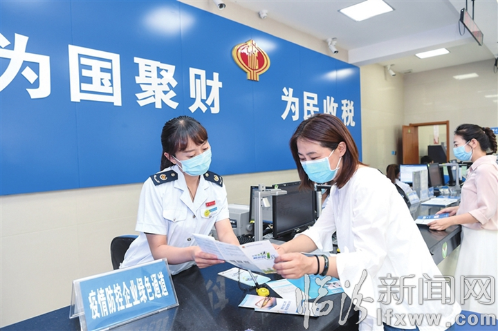临汾新闻网讯 为支持企业复工复产,古县税务局办税服务大厅开通疫情防控绿色通道,提供线上办理、预约办理、邮寄办理等多种办税方式,方便企业办理涉税事项。图为5月29日,工作人员在向企业纳税人介绍办税注意事项。