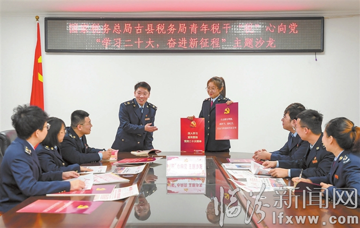 临汾新闻网讯 连日来,国家税务总局古县税务局举办了“税”心向党,“学习二十大,奋进新征程“主题沙龙活动,组织青年干部学习党的二十大精神。图为该局青年税干们在主题沙龙上交流学习心得。