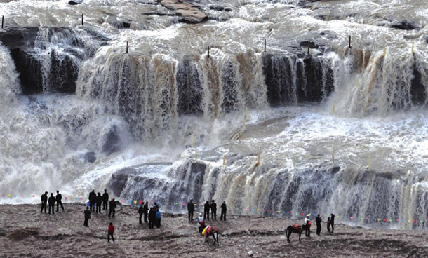 3月18日,游客在山西吉县欣赏黄河壶口瀑布“桃花汛”。 受近日气温回暖影响,位于山西吉县和陕西宜川县交界的壶口瀑布迎来五年来最早“桃花汛”,大量槽蓄水奔腾而下,形成壮观瀑布群,吸引众多游客前来观看。 每年三月到四月,黄河内蒙古段冰凌消融形成春汛,由于恰逢黄河沿岸山桃花盛开的季节,故被称为“桃花汛”。