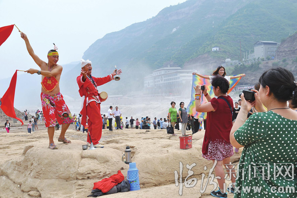 8月24日,民间艺人刘爱国在吉县黄河壶口瀑布景区为游客表演。今年59岁的刘爱国会说六国常用旅游语言,劈跨、下腰、飞脚像个小伙子,他演唱的《信天游》豪迈激荡,每次表演都会赢得游客的阵阵掌声,成为景区一道亮丽的风景线。 张保华 摄