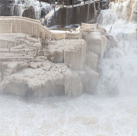 随着近一段时间气温下降,壶口瀑布呈现出了壮观景色,河中冰凌骤然增多,一早一晚壶口瀑布岸边形成了状态各异的冰柱,吸引了众多国内外游客参观游览。 李峰 摄