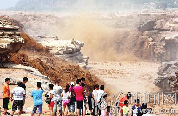 临汾新闻网讯 8月21日,游客在欣赏奔腾咆哮的壶口瀑布。近日,受上游强降雨影响,黄河干流晋陕峡谷持续大流量洪水,吉县黄河壶口瀑布水量暴涨,形成近千米的壮美瀑布群。(吕桂明)