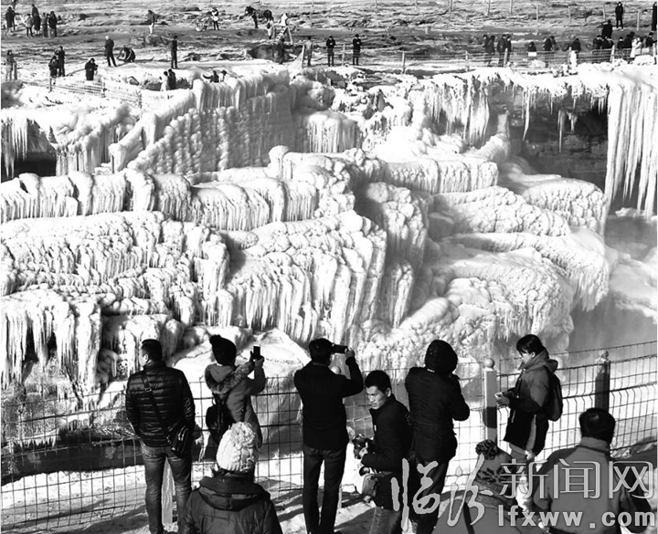临汾新闻网讯 近日,游客在吉县黄河壶口瀑布欣赏冰瀑冰雕景观。随着气温持续下降,吉县黄河壶口瀑布一片银装素裹,瀑布两岸大面积的冰瀑、冰雕奇观,吸引了大批来自全国各地的游客和摄影爱好者。