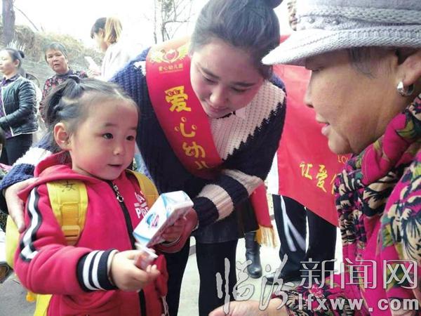 洪洞爱心幼儿园的小朋友向李苏爱献上自己的一片爱心。