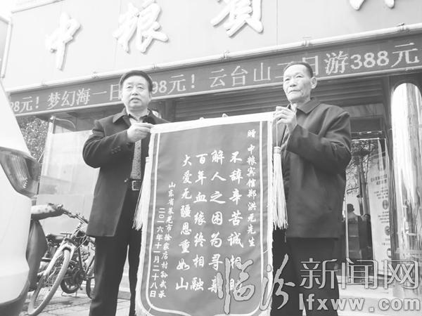 临汾新闻网讯 (记者 张春茂)11月28日中午,山东寻亲者孙武承及儿子孙洪伟等临别前,将一面锦旗送到了洪洞好心人郑洪元手中,并当面感谢了提供重要线索的洪洞郝先生父子。令孙武承等人高兴的是,族谱中记载的孙曰良移居“洪洞安乐镇”一谜也得以解开。