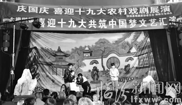临汾新闻网讯 日前,洪洞县戏剧家协会与大槐树镇联合举办了“喜迎十九大、共筑中国梦”农村戏曲展演。该县围绕“庆国庆”“喜迎十九大”开展了10余项群众文化活动。图为演员们正在表演眉户小戏《一掛破车儿》。