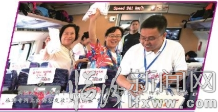 洪洞县文物旅游中心主任李晋豪在“向洪洞出发-回家”首发高铁旅游专列上向游客发放“洪洞印象”礼包