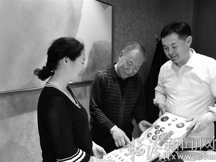 徐范锁(中)给集邮爱好者展示藏品。