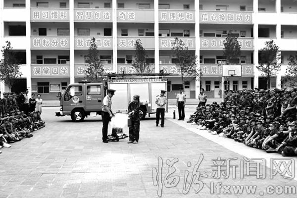 临汾新闻网讯 近日,侯马市公安局消防大队组织消防人员走进502学校开展消防知识“进军训”活动,切实提高广大学生的消防安全素质和逃生自救能力,活动中,大队宣传人员通过散发传单、现场讲解等方式,以校园典型火灾事故案例为切入点,为学生讲解了消防安全常识以及正确报警、火场逃生、扑灭初起火灾等消防技能要点,并手把手向学生讲解干粉灭火器的使用方法及注意事项。 郭清海 摄