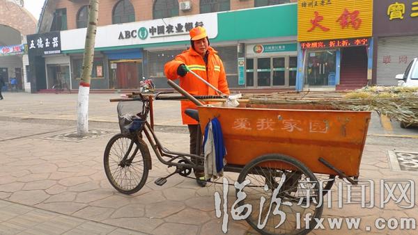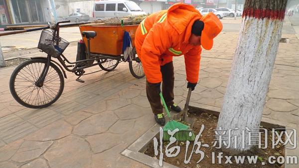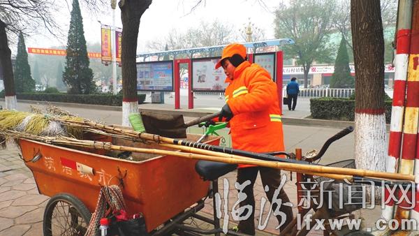 29日,天气干冷,最低温度达到0℃。笔者执笔的手渐渐有些麻木,路上的行人也是个个裹得严严实实,但郭西平看上去脸虽通红,却表现得不怎么有冷感。“不冷。我外面穿的是棉袄厚,里面只穿一件秋衣,还热得不行。凌晨再冷,都是穿秋衣扫街,还是一身汗。”