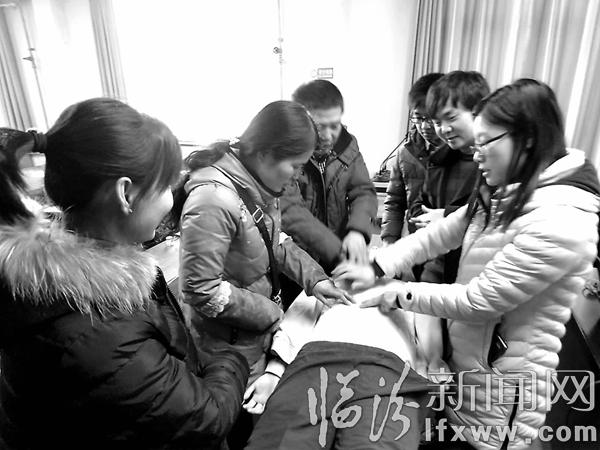 临汾新闻网讯 为提高职工的现场紧急救护能力,日前,侯马电务段组织机关科室、车间、工区的红十字管理人员举办了以救护新概念、心肺复苏、创伤救护为主要内容的红十字知识技能的救护培训。图为该电务段红十字管理人员正在现场摹拟救护要领。(白鹏)