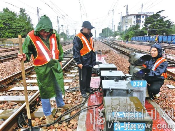 临汾新闻网讯 7月14日,太原铁路局侯马电务段的干部和职工在冒雨巡检电务信号设备。侯马电务段针对近期降雨偏多的情况,加大对信号机、电缆等设备设施的检查整治力度,确保汛期设备安全运行。白鹏 摄