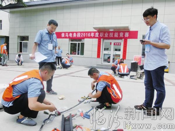 临汾新闻网讯 7月20日,侯马电务段参赛职工正在段机关院内进行着一场紧张的信号电缆接续技能角逐。今年5月份以来,该段组织干部职工立足岗位实际,在采取集中学、岗位学、自修学、研讨学等多种形式基础上,着力开展以强化职工基本规章运用、应知应会补强和非正常应急处置为主要内容的岗位技能提素达标比武竞赛活动。(白鹏)