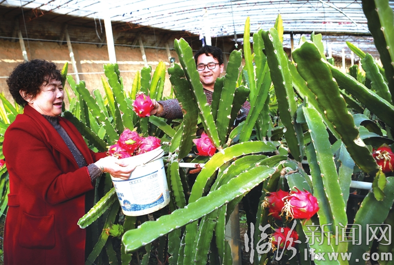 临汾新闻网讯 经过3年的摸索,如今,侯马市自主创业青年高建伟种植的火龙果每亩年产2500公斤以上,净收入8万元。高建伟在北方试种火龙果的成功经验,吸引了来自新疆、石家庄、太原、晋城、新绛等地的大学毕业生纷纷前来取经学习,并在各地试种成功。图为高建伟与母亲近日在自家火龙果基地采摘成熟的果子。