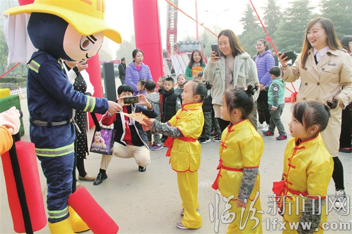 临汾新闻网讯 11月8日,侯马市消防大队在新田广场举行以“防范火灾风险 建设美好家园”为主题的消防安全宣传活动。图为消防员向儿童们发放消防宣传册。
