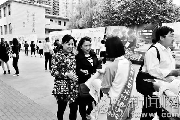 临汾新闻网讯 眼下进入了招生热季,霍州职业中专学校制作了十四块大型展板,通过宣传在京津地区及太原的优秀就业学生的事迹,使人们对职业院校学习就业工作有了一个深入的认识。图为学生志愿者向学生家长介绍就业方向。 (霍职)
