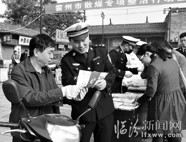 临汾新闻网讯 连日来,霍州市公安局民警在州署广场开展散煤专项整治宣传活动。活动通过设立咨询台,发放知识手册,向过往群众宣传散煤管控的相关政策。同时,利用电子屏、宣传栏、微信公众平台等新媒体对清洁煤进行推广宣传。活动累计发放各类宣传资料3500余份,接受群众咨询1500人次。图为民警为群众发放创造健康宜居生活环境宣传资料。