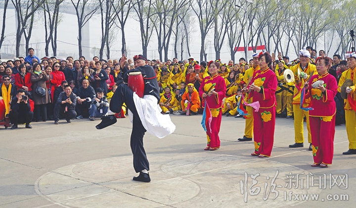 随后,热闹的社火表演拉开帷幕。首先上场的是霍州百人威风锣鼓表演,虽然女子占了多数,但雄风依旧,表现出如春雷滚动、万马奔腾的磅礴气势。