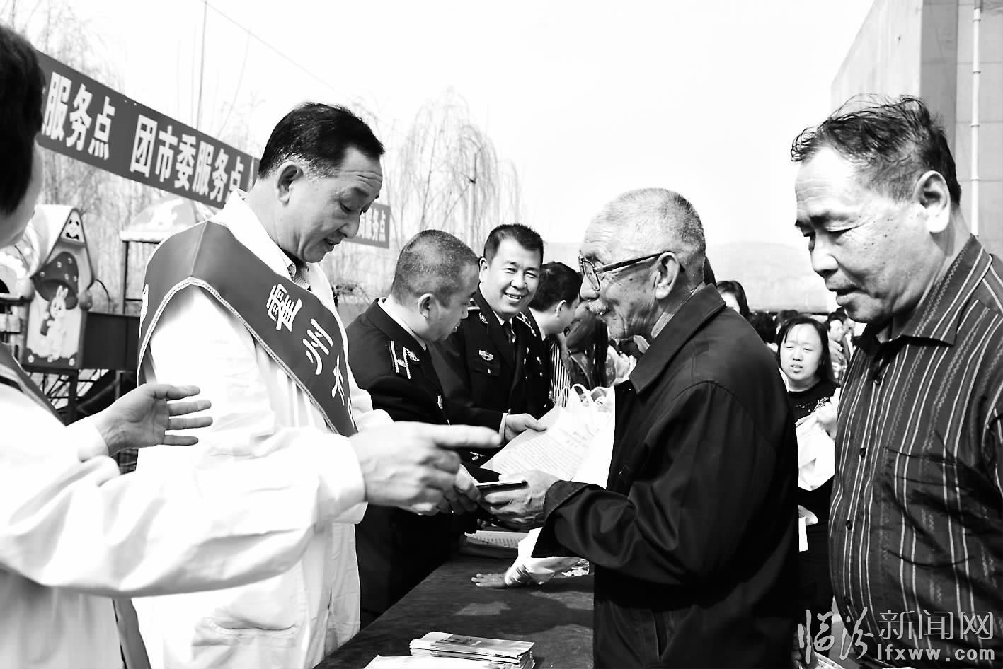 3月27日,霍州市文化、科技、卫生“三下乡”活动在该市辛置镇辛置村启动。活动中,该市组织卫生、科技、残联等19家服务单位100余名专业技术人员,为农民开展义诊,宣传健康、卫生、法律等知识,传授农业科技,深受广大农民的欢迎。图为工作人员为村民散发宣传资料。