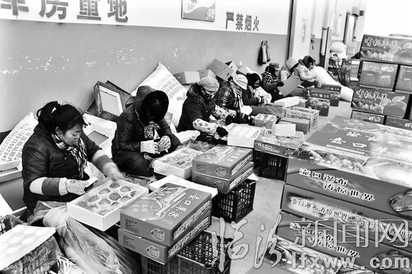 临汾新闻网讯 近日,吉县聚宝壶果业公司工作人员将气调库里的苹果贴标、装箱,销往南方。该公司有苹果气调冷藏库16个,年贮存苹果8000吨,服务农户1000余户,销售旺季日均用工达100余人,带动了一方农民增收。