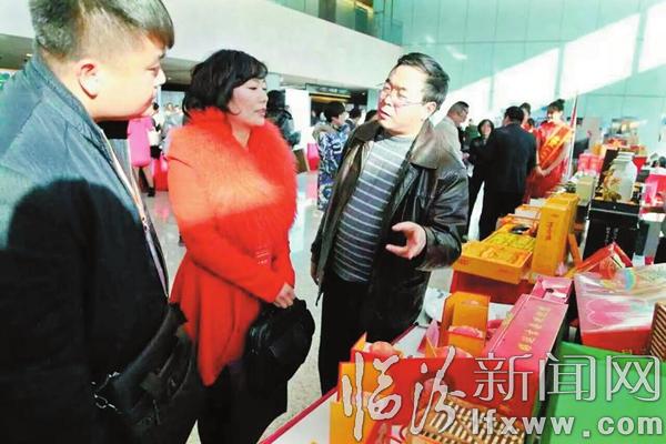图为他在北京国家会议中心为参会人员介绍吉县苹果。郭丰瑞 摄
